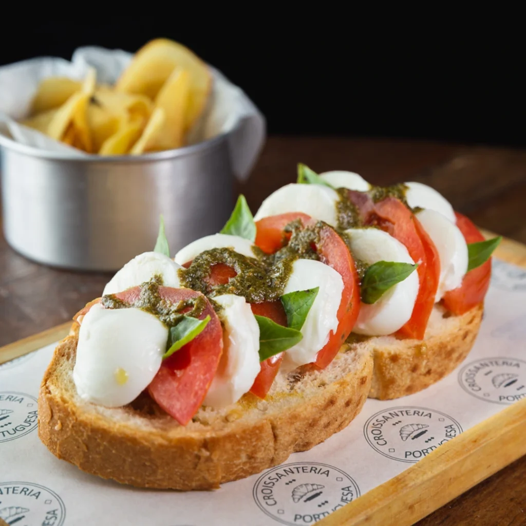 Pão Italiano com tomate, muçarela de búfala, molho pesto e manjericão fresquinho.